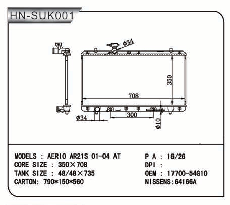 - Применяемость: AT, SUZUKI AERIO 01-04 нижний патрубок слева